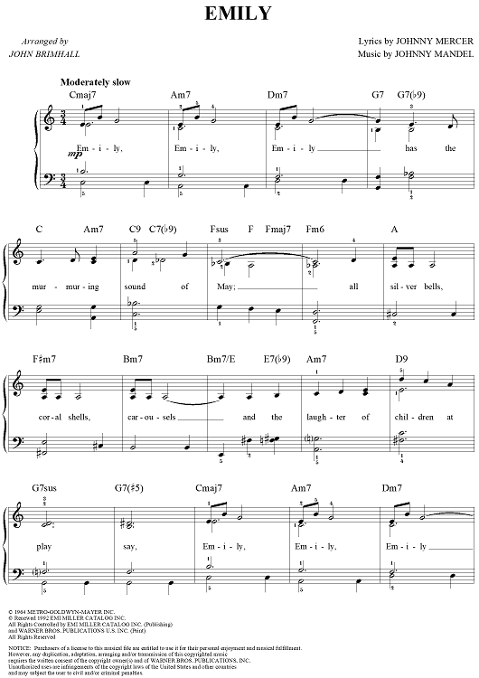 Digital Sheet Music for Emily by Johnny Mercer, Johnny Mandel, John Brimhall scored for Easy Piano/Vocal; id:252428
