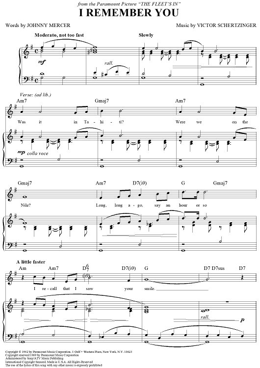 Digital Sheet Music for I Remember You by Johnny Mercer, Victor Schertzinger scored for Piano/Vocal/Chords; id:362452
