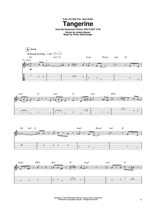 Digital Sheet Music for Tangerine by Johnny Mercer, Victor Schertzinger, Jim Hall scored for Guitar Tab; id:387789