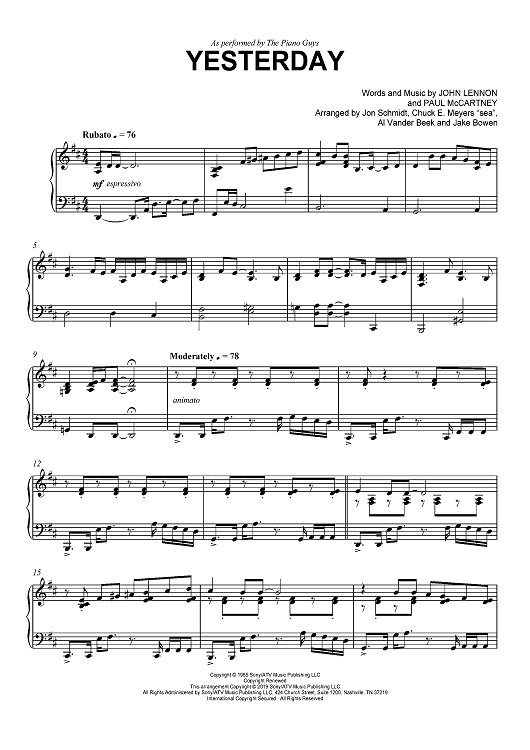 Digital Sheet Music for Yesterday (As performed by the Piano Guys) by Paul McCartney, John Lennon, Jon Schmidt, Al Van Der Beek, The Piano Guys, Chuck E Meyers "sea", Jake Bowen scored for Piano Solo; id:467681