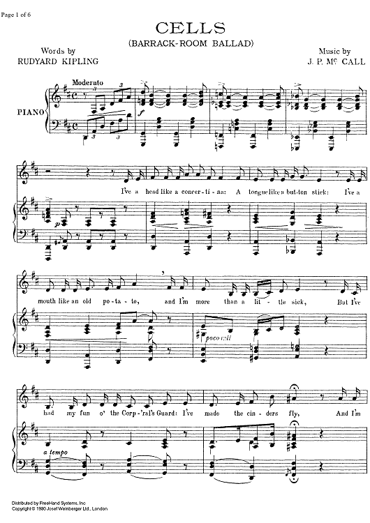 Digital Sheet Music for Cells (Barrack-Room Ballad) by , J. P. McCall scored for Voice/Piano; id:348377