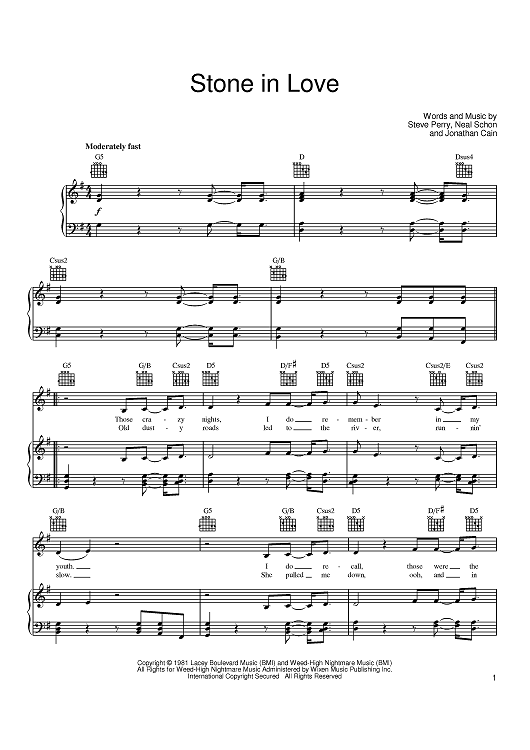 Digital Sheet Music for Stone In Love by Steve Perry, Neal Schon, Jonathan Cain, Journey scored for Piano/Vocal/Chords; id:394150