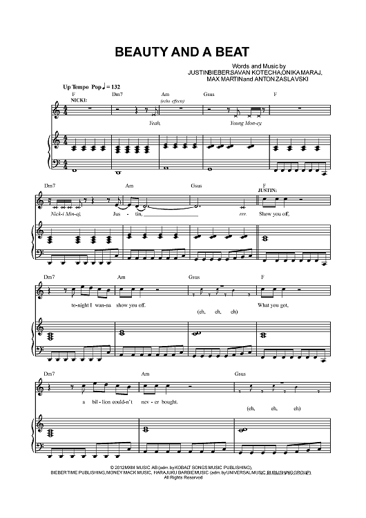 Digital Sheet Music for Beauty And A Beat by Max Martin, Savan Kotecha, Justin Bieber, Onika Maraj, Anton Zaslavski scored for Piano/Vocal/Chords; id:433235