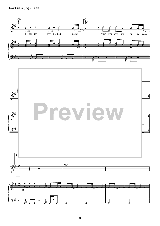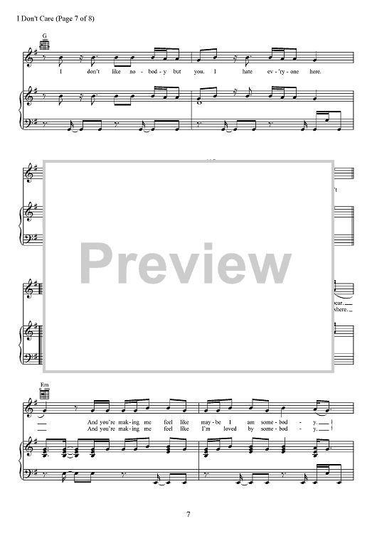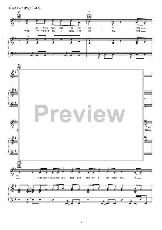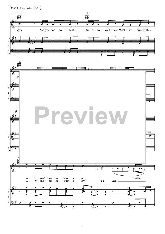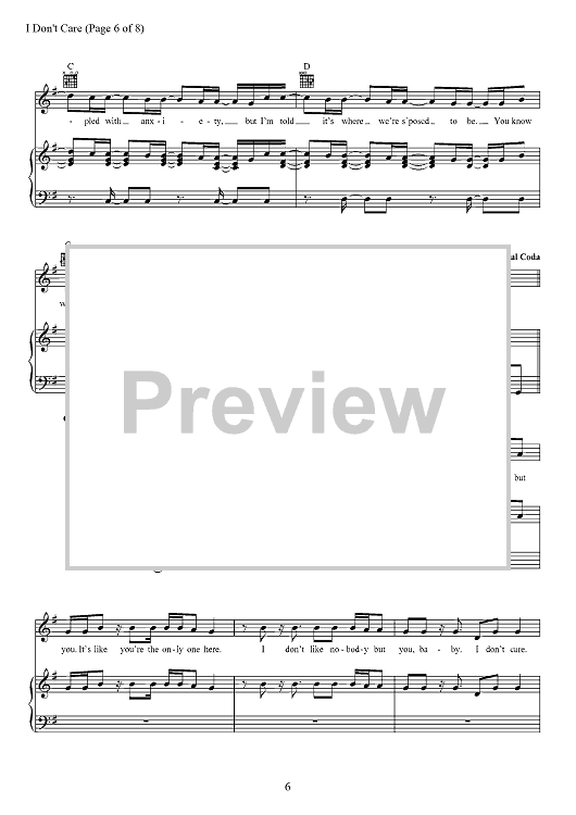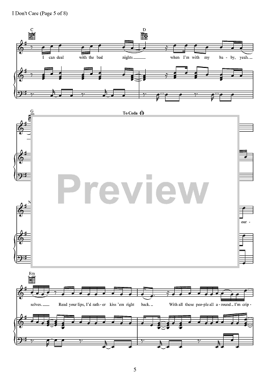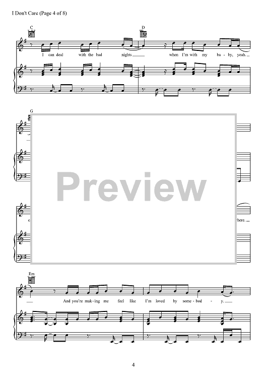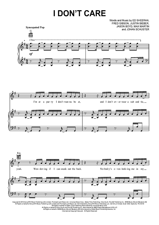 Digital Sheet Music for I Don't Care by Max Martin, Jason Boyd, Justin Bieber, Johan Schuster, Ed Sheeran, Fred Gibson scored for Piano/Vocal/Chords; id:467545