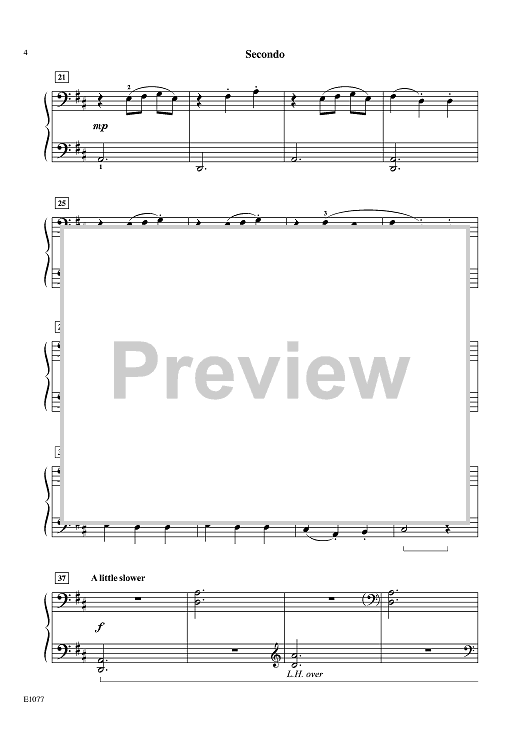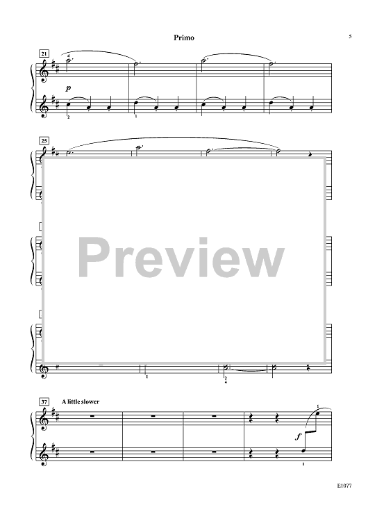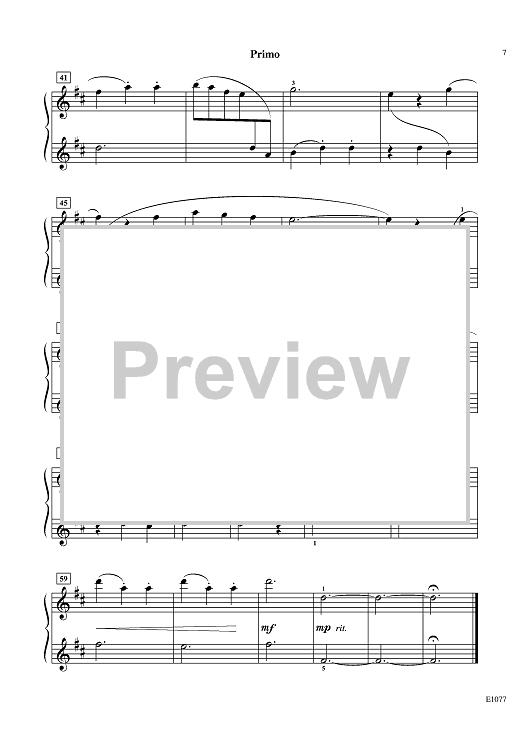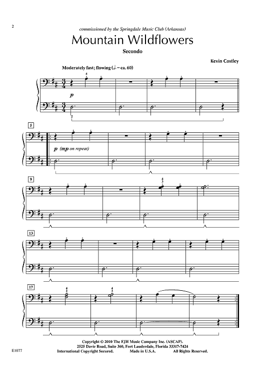 Mountain Wildflowers is a charming folk/country duet written in the key of G major and in 3/4. This piece, written for four hands, one piano, gives each the primo and secondo part a turn playing the melody, offering a variety of phrasing and articulations.