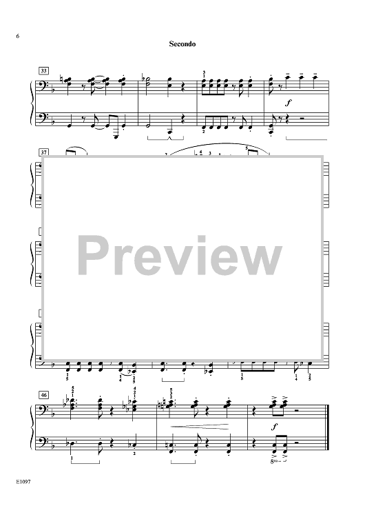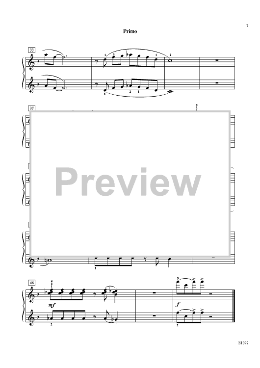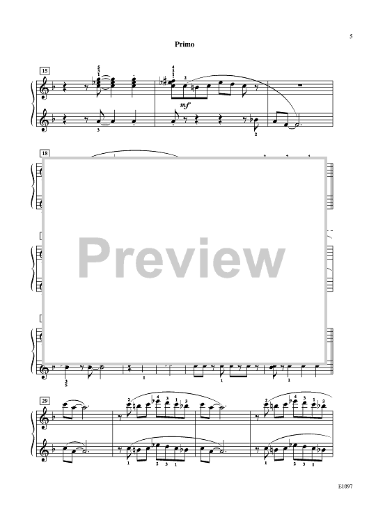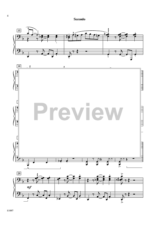 This light, rhythmic duet in the key of F major passes the melody between the Secondo and Primo a few times. The syncopation, thick sonority, and frequent accidentals give it a twinge of Latin jazz. The cheerful upbeat tempo makes this a nice opener or closer for any recital.