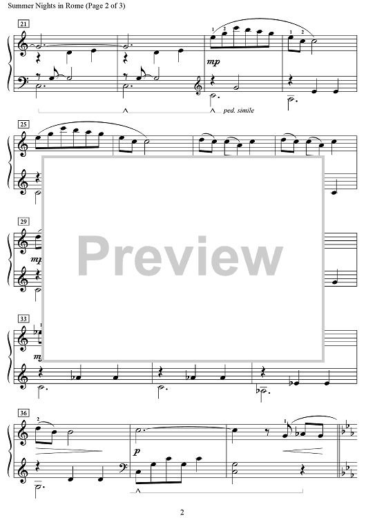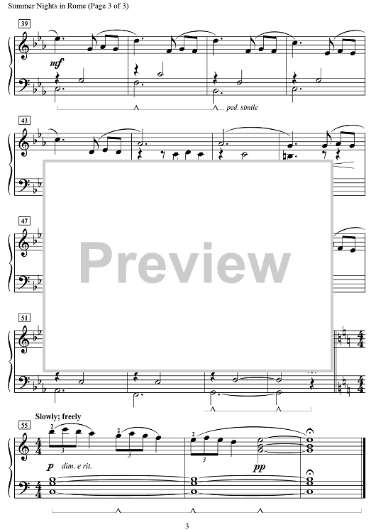 A nostalgic remembrance of a memorable trip to Rome, this bitter-sweet waltz staring in C minor, followed by a contrasting section in C major. It presents an artistic study for short phrases and legato pedaling throughout.
