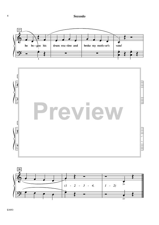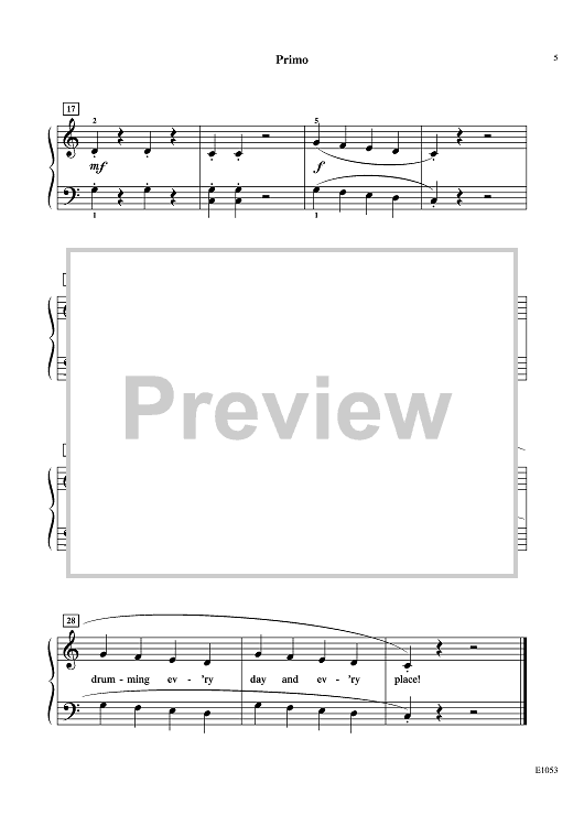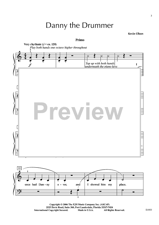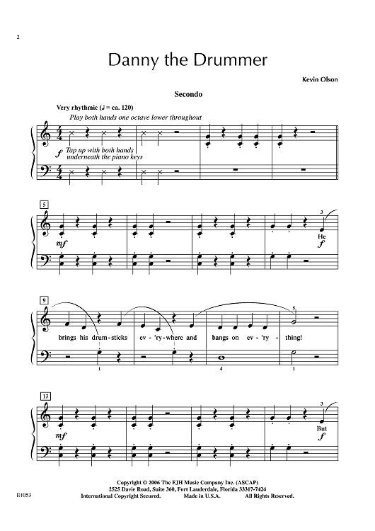 Written for one piano four hands, this elementary level duet provides a spirited rhythmic experience that both the primo and secondo parts participate in. Included are opportunities for students to tap a rhythm underneath the piano keys while the other part plays notes on the keys. Each part contains a variety of articulations, with amusing lyrics about Danny the Drummer that your students will love playing together!