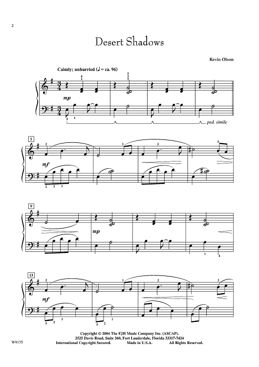 For intermediate students, Desert Shadows offers a sophisticated sound they are sure to enjoy. This piece features artistic jazz-like harmonies, rhythmic play between the hands, and many opportunities for working with singing melody and legato pedal.