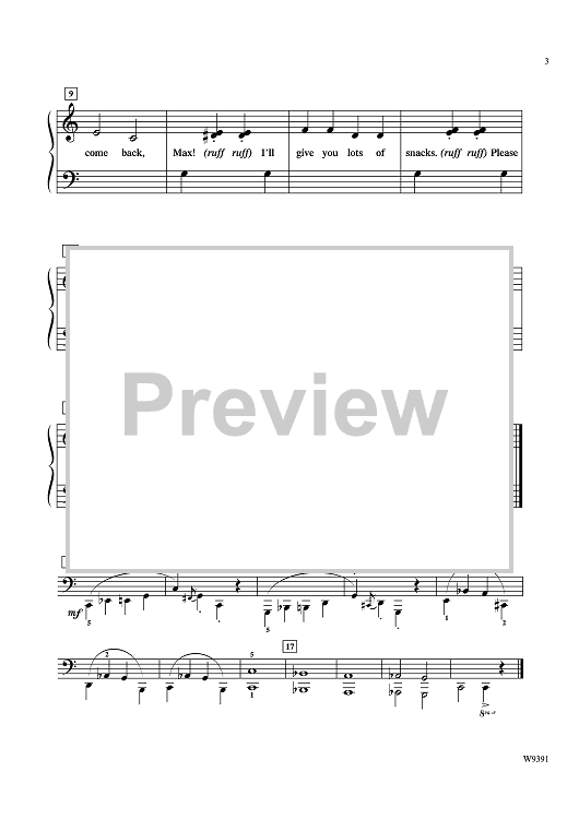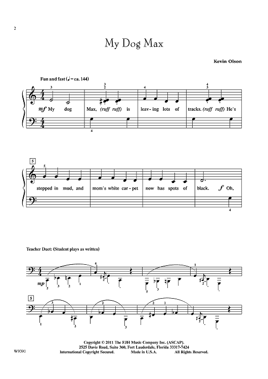 This colorful recital piece is in Middle C position with staccato seconds imitating the "ruff ruff" and an optional teacher duet. The animated lyrics tell the tale of a precocious pet in a "fun and fast" tempo.