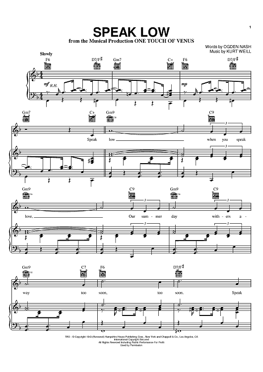 Digital Sheet Music for Speak Low by Frank Sinatra, Billie Holiday, Sarah Vaughan, Ogden Nash, Kurt Weill scored for Piano/Vocal/Chords; id:373304