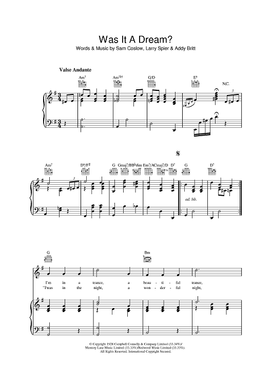 Digital Sheet Music for Was It A Dream by Sam Coslow, Addy Britt, Larry Spier scored for Piano/Vocal/Chords; id:392644