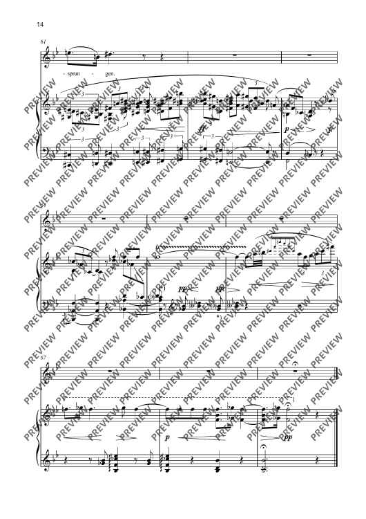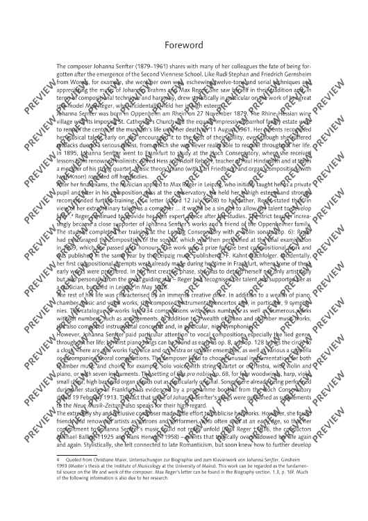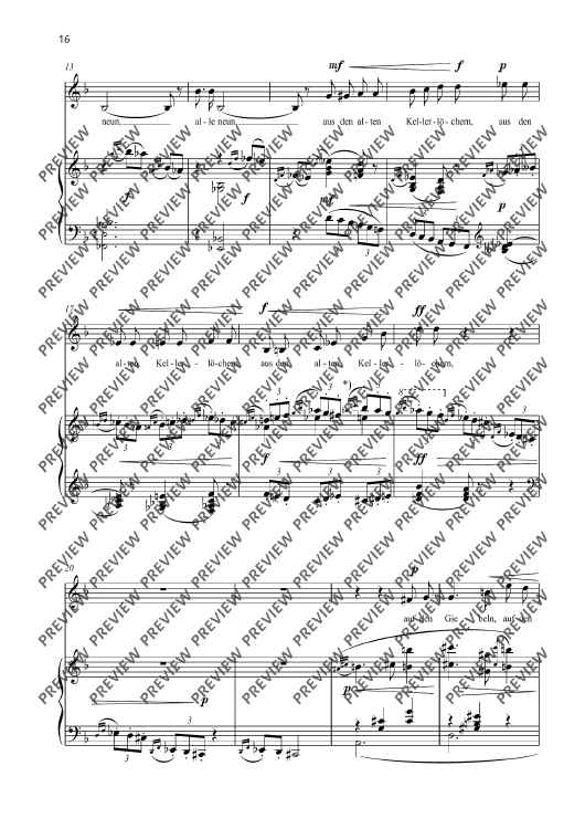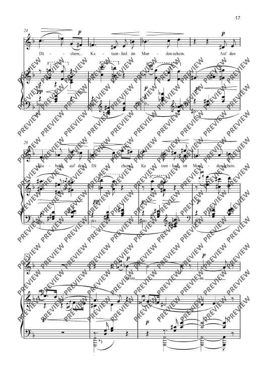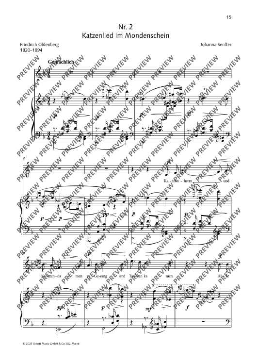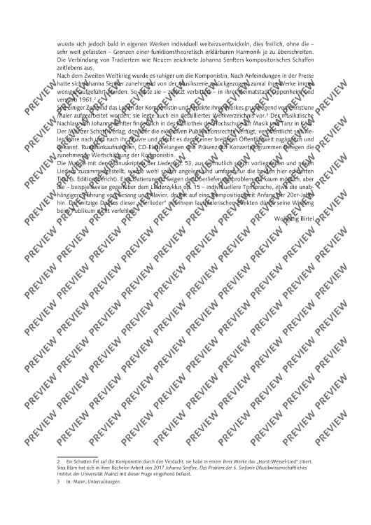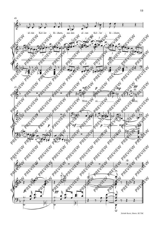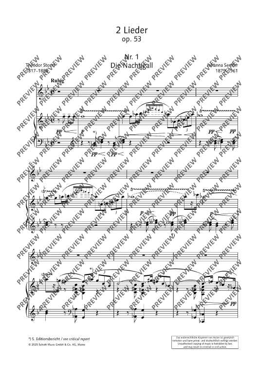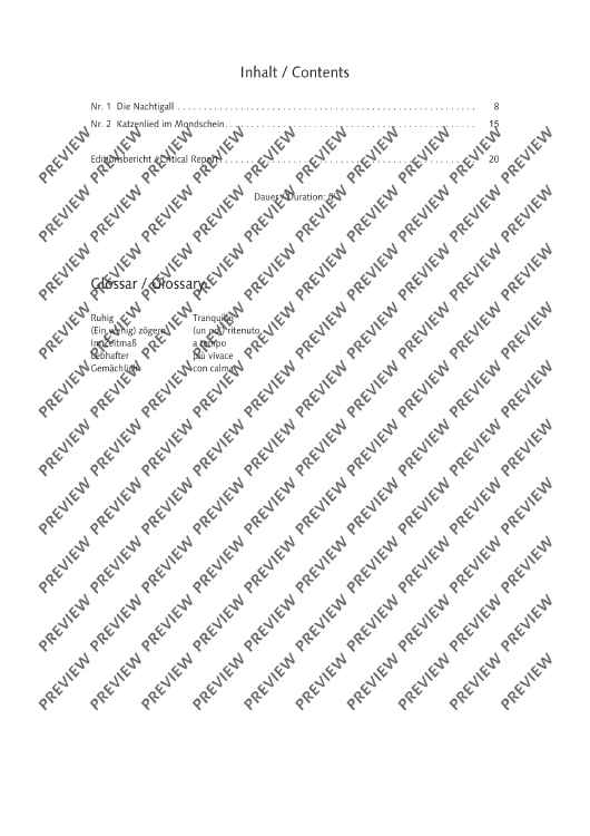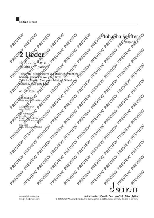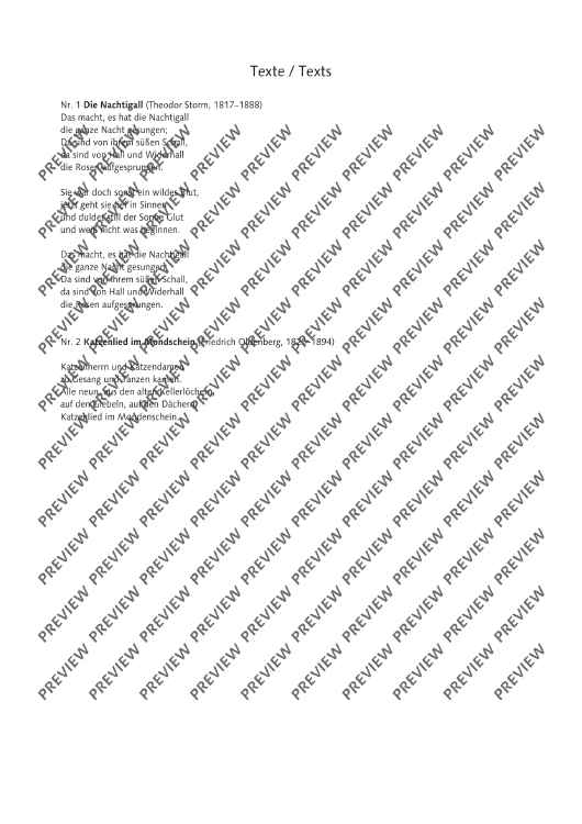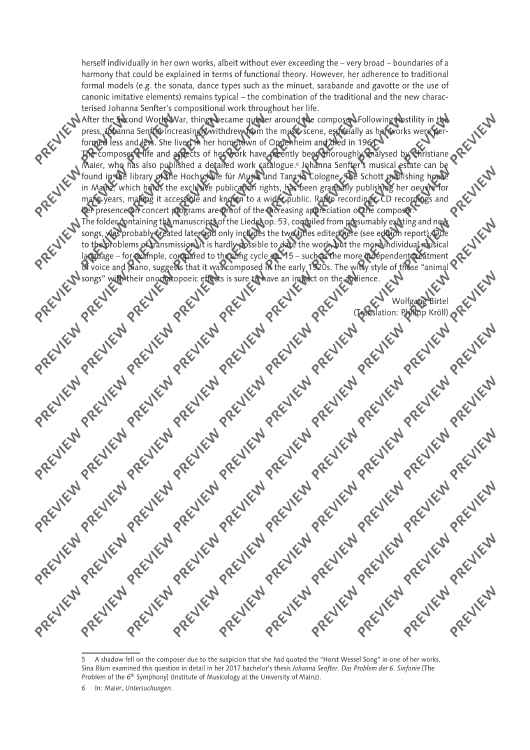 The Lieder op. 53 originally included two more songs which have not been transmitted. Due to the problems of transmission, it is hardly possible to date the work, but the more individual musical language such as the more independent treatment of voice and piano, suggests that it was composed in the early 1920s. The witty style of these transmitted “animal songs” with their onomatopoeic effects is sure to have an impact on the audience. The first song Die Nachtigall (The Nightingale) was also arranged for voice, flute and piano by Senfter herself and is being published simultaneously (ED 24001).