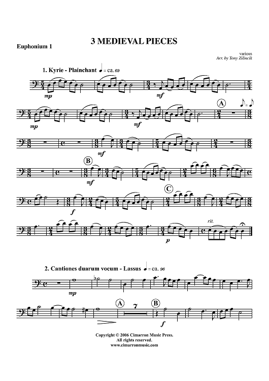 Digital Sheet Music for 3 Medieval Pieces - Euphonium 1 BC/TC by Various, Tony Zilincik scored for Tuba Quartet; id:357939