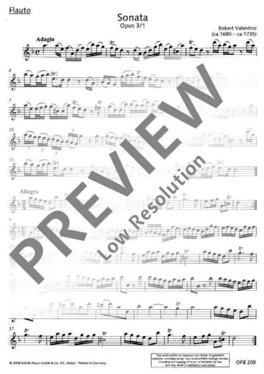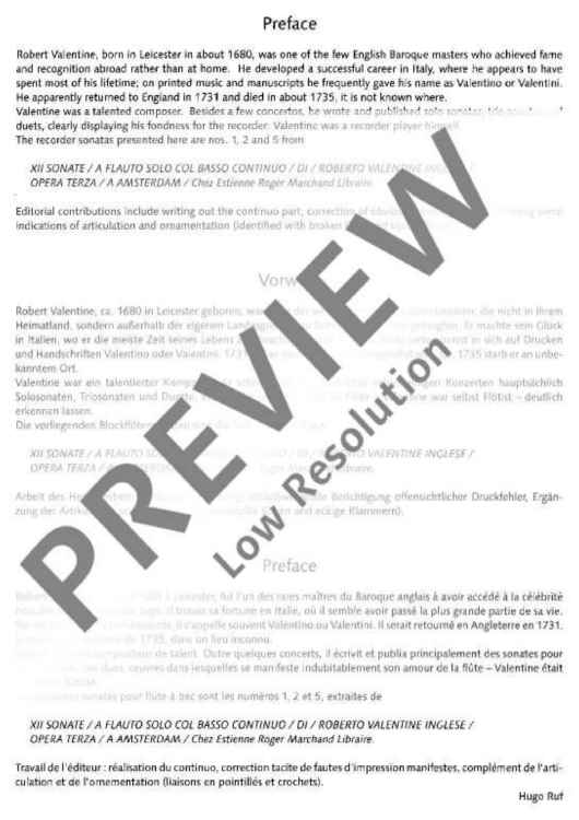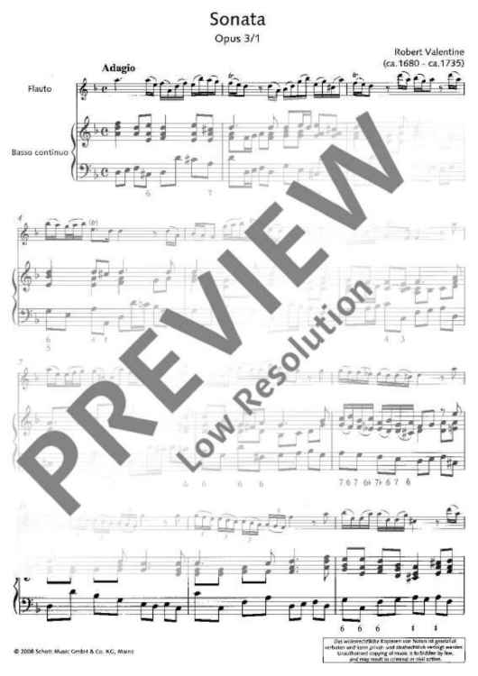 Robert Valentine, born in Leicester around 1680, was one of the few English masters of Baroque music who achieved fame and enjoyed a high standing beyond the borders of his home country instead of within. He made his fortune in Italy where he seemed to have spent most of his lifetime. It is assumed that he returned to England in 1731. He died at an unknown place around 1735. Valentine was a talented composer. Apart from some concertos, he mainly wrote and published solo sonatas, trio sonatas and duets, works who clearly show his preference for the flute, he himself being a flutist.