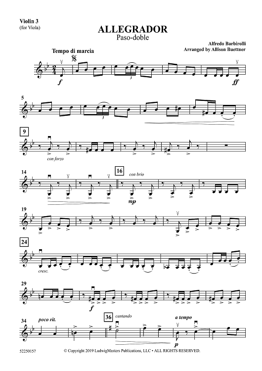 Digital Sheet Music for Allegrador Paso Doble - Violin 3 (for Viola) by Allison Buettner, Alfredo Barbirolli scored for String Orchestra; id:509063
