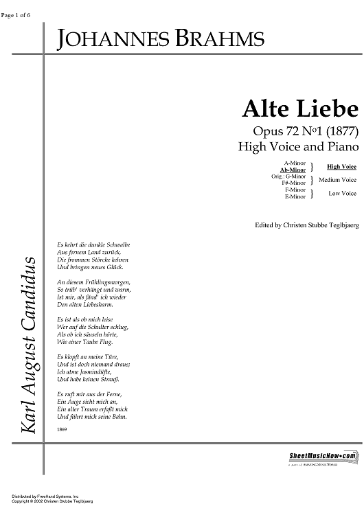 Digital Sheet Music for Alte Liebe Op.72 No. 1 by , Johannes Brahms scored for Soprano or Tenor/Piano; id:336946