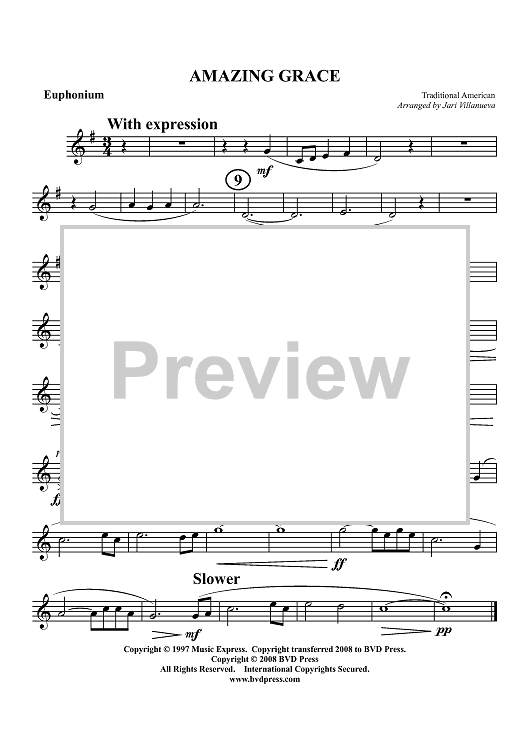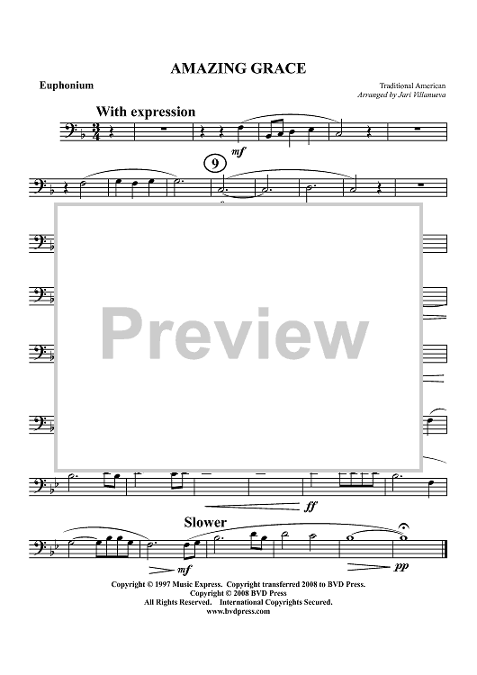 Digital Sheet Music for Amazing Grace - Euphonium by Traditional American Melody, Jari Villanueva scored for Brass Ensemble; id:411928