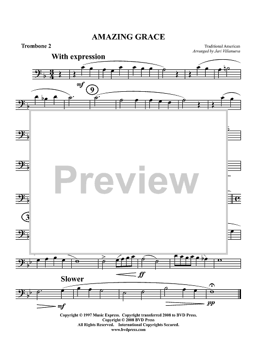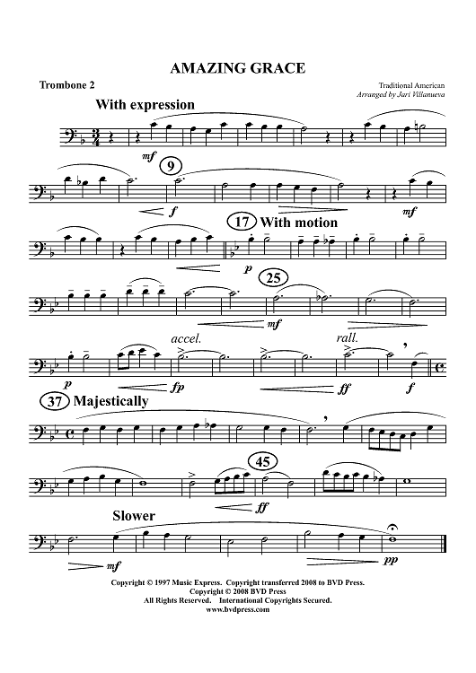 Digital Sheet Music for Amazing Grace - Trombone 2 by Traditional American Melody, Jari Villanueva scored for Brass Ensemble; id:411926
