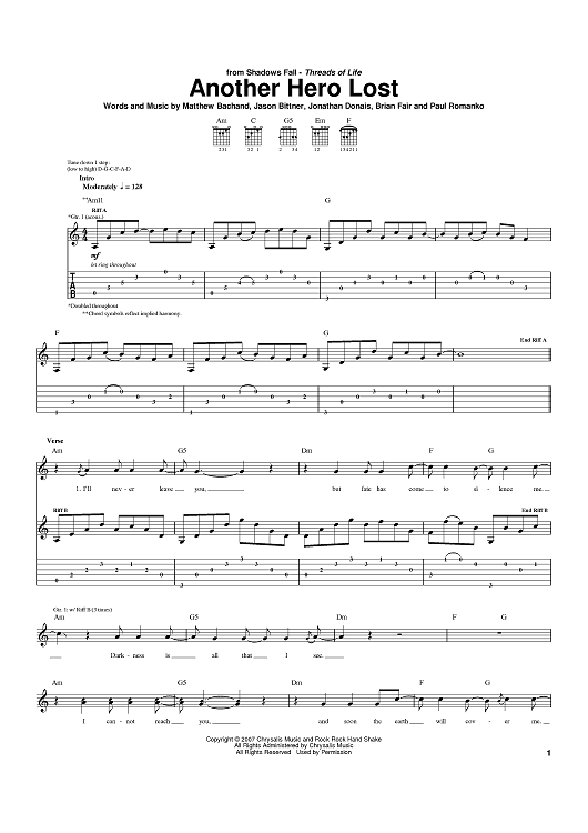 Digital Sheet Music for Another Hero Lost by Matthew Bachand, Jason Bittner, Jonathan Donais, Brian Fair, Paul Romanko, Shadows Fall scored for Guitar Tab; id:397412