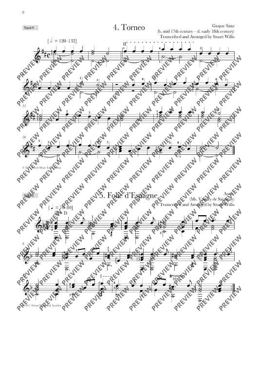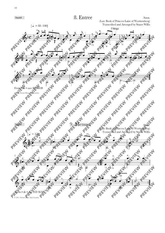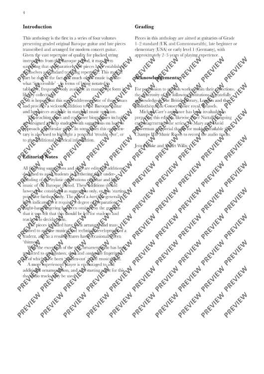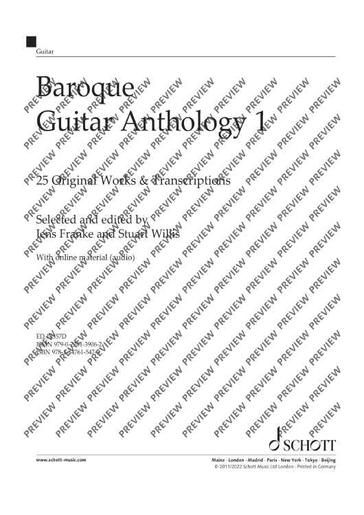 The author of the successful Romantic Guitar Anthology series, Jens Franke, returns with a new collection of pieces from the 17th and 18th centuries. The first volume of the Baroque Guitar Anthology contains 25 beautiful and rarely available pieces transcribed for guitar by co-author Stuart Willis, including works by Gaspar Sanz, David Kellner and Robert De Visée. The book includes composer biographies and teaching notes on each piece, together with a recording of all works (mp3 download) performed by Jens Franke. Suitable for students of c.2-3 years of playing experience, or grades 1-2 level. Also available: Baroque Guitar Anthology: Vol 2 – ED 13437 Vol 3 – ED 13446 Vol 4 – ED 13489 Romantic Guitar Anthology: Vol 1 – ED 13110 Vol 2 – ED 13111 Vol 3 – ED 13112 Vol 4 – ED 13113 BAROQUE GUITAR ANTHOLOGIES - press reviews "This is a significant contribution to Baroque literature... teacher and student are the lucky beneficiaries of this great collection. Jens, Stuart and Schott are all to be congratulated." - COLIN TOMMIS, EUROPEAN GUITAR TEACHERS ASSOCIATION