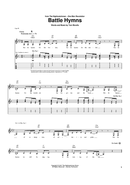 Digital Sheet Music for Battle Hymns by Tom Morello, The Nightwatchman scored for Guitar Tab; id:401123