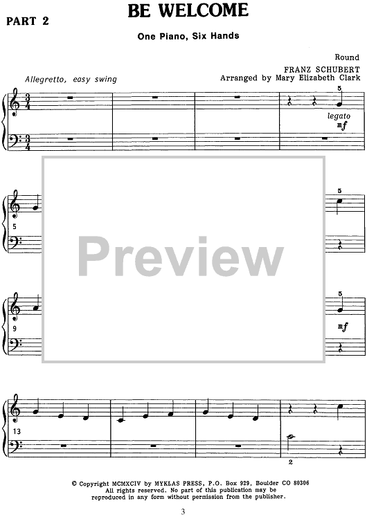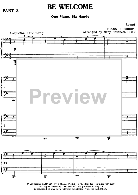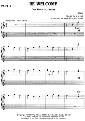 Three performers at one piano will be delighted with this Schubert "round," which is written in 3/4 time and in C Major. All three parts have turns at the melodic themes, which wind between them, one after another. Three individual pages are provided, one for each separate part, and the entire score is included a second time on the inside and outside of the song's cover.