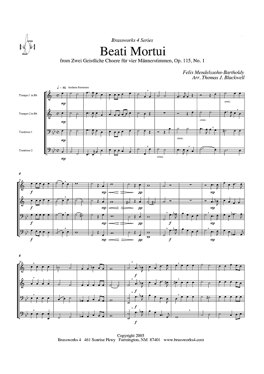 Digital Sheet Music for Beati Mortui - Score by Felix Mendelssohn, Thomas J. Blackwell scored for Brass Quartet; id:318790