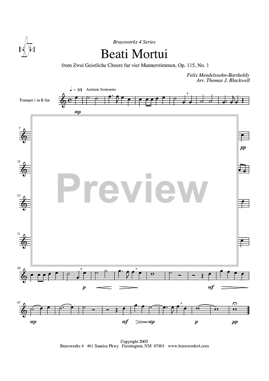 Digital Sheet Music for Beati Mortui - Trumpet 1 by Felix Mendelssohn, Thomas J. Blackwell scored for Brass Quartet; id:318791