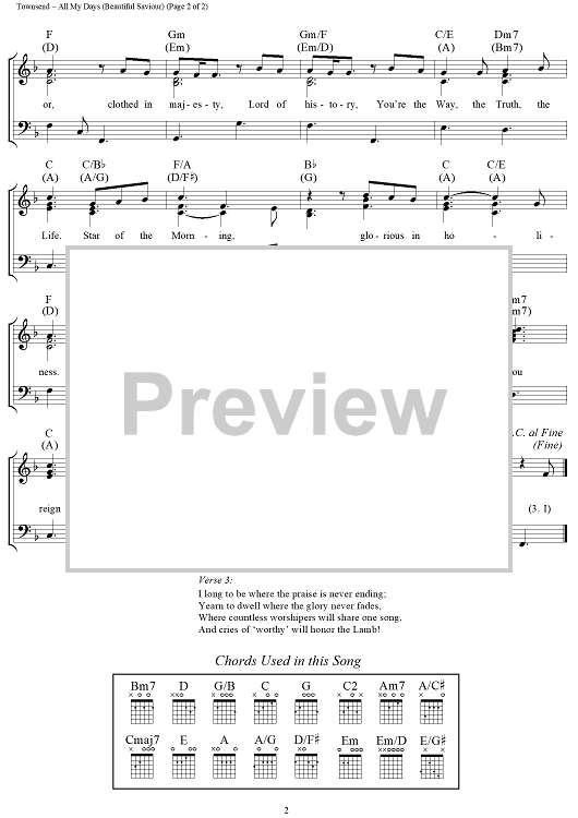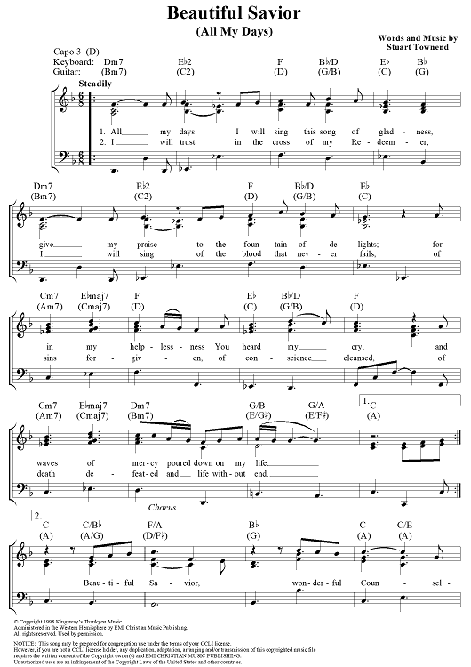 Digital Sheet Music for Beautiful Savior (All My Days) by Stuart Townend scored for Piano/Vocal/Chords; id:113699