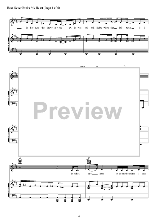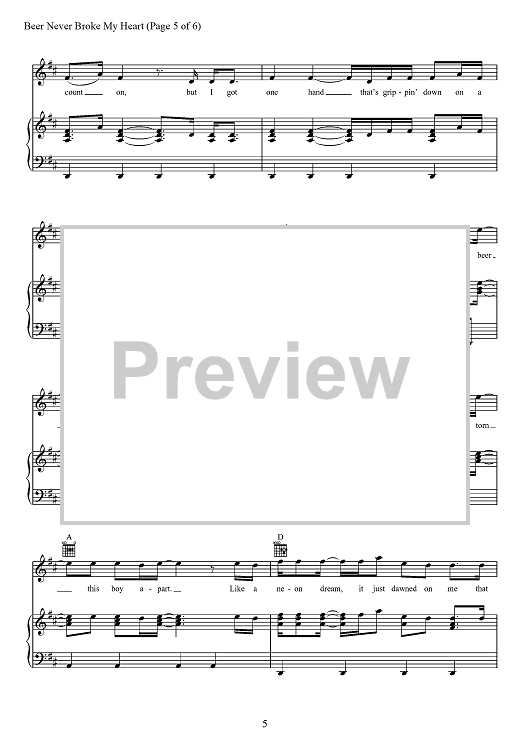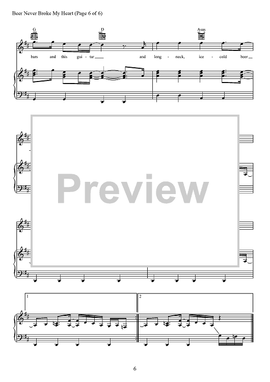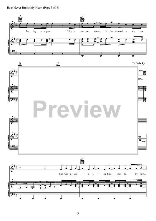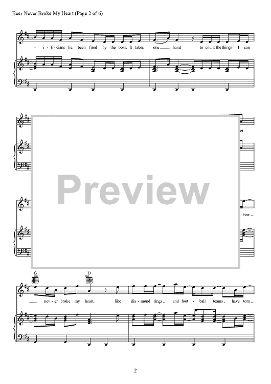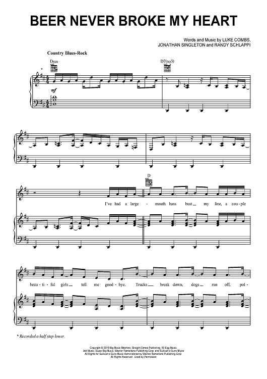 Digital Sheet Music for Beer Never Broke My Heart by Jonathan Singleton, Luke Combs, Randy Schlappi scored for Piano/Vocal/Chords; id:467540