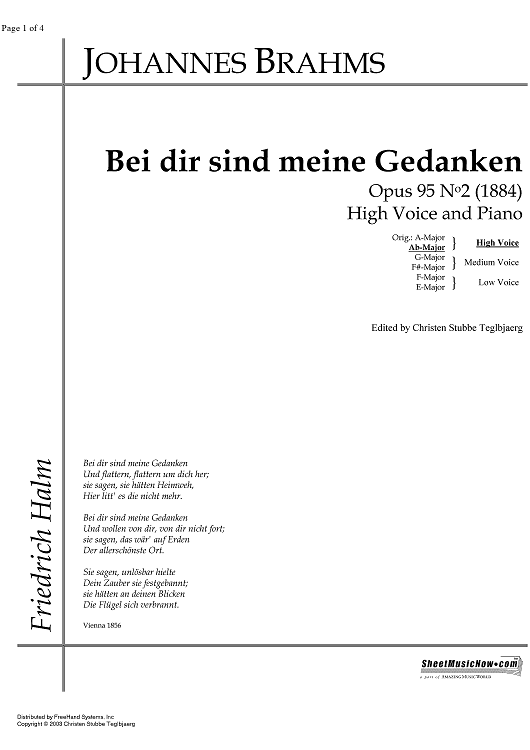 Digital Sheet Music for Bei dir sind meine Gedanken Op.95 No. 2 by , Johannes Brahms scored for Soprano or Tenor/Piano; id:338143
