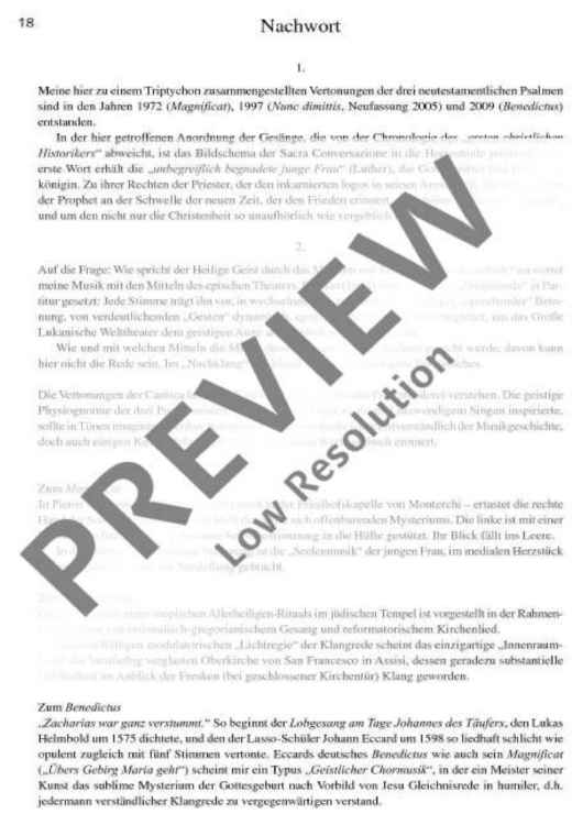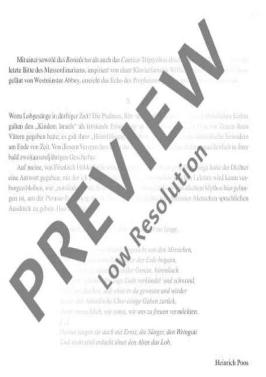 Heinrich Poos set to music Canticum Zachariae, one of the three most outstanding ones from St. Luke's Gospel, as a dense, speech-generated setting: The entirely homophonic Benedictus is followed by a contrapuntally ingenious Dona nobis pacem which brings the six-part a-cappella chorus to an evocative end.