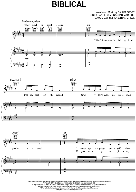 Digital Sheet Music for Biblical by James Bay, Calum Scott, Corey Sanders, Jonathan Maguire scored for Piano/Vocal/Chords; id:469348