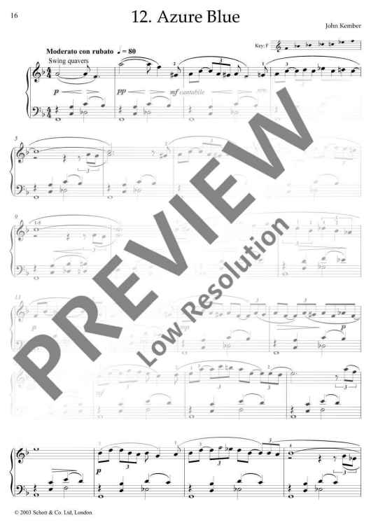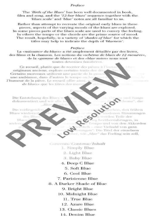 A collection of 14 original pieces exploring aspects of the varying moods of the blues. Satisfying and fun to play, moderate to challenging in difficulty (UK Piano Examination Grades 4-6).