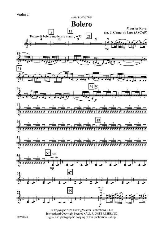 Digital Sheet Music for Bolero for Strings - Violin 2 by Maurice Ravel, J. Cameron Law scored for String Orchestra; id:508354