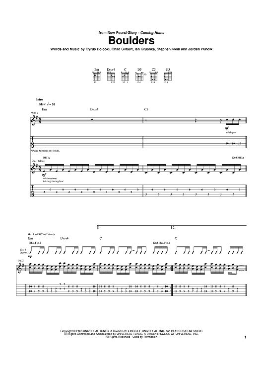 Digital Sheet Music for Boulders by New Found Glory, Cyrus Bolooki, Chad Gilbert, Ian Grushka, Steve Klein, Jordan Pundik scored for Guitar Tab; id:397794