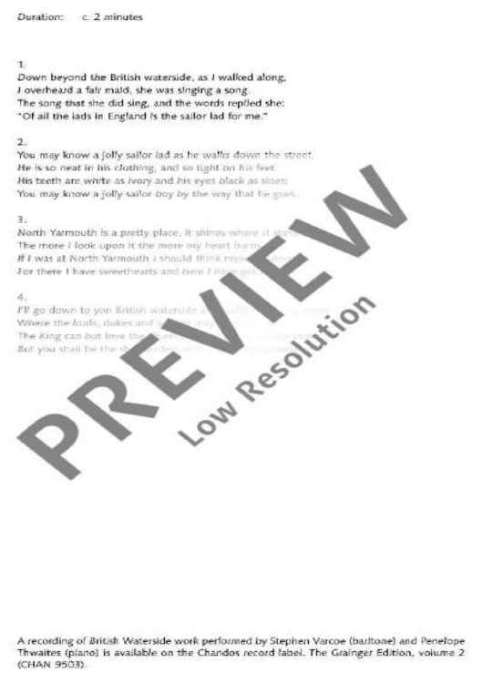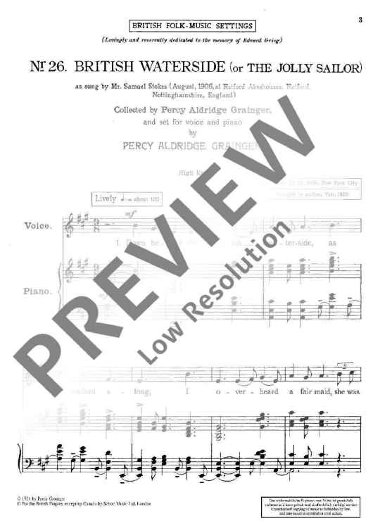 British Waterside (or The Jolly Sailor) as sung by Mr Samuel Stokes (August, 1906, at Retford Almshouses, Retford, Nottinghamshire, England). Collected by Percy Aldridge Grainger and set for voice and piano by Percy Aldridge Grainger.High key version, range = E-E (one octave), maybe sung at any octave.