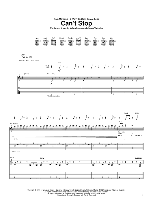 Digital Sheet Music for Can't Stop by Adam Levine, Maroon 5, James Valentine scored for Guitar Tab; id:401089