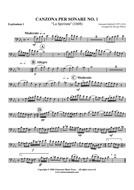 Digital Sheet Music for Canzon per Sonare No. 1 "La Spiritata" (1608) - Euphonium 1 BC/TC by Giovanni Gabrieli, George Palton scored for Tuba Quartet; id:416335