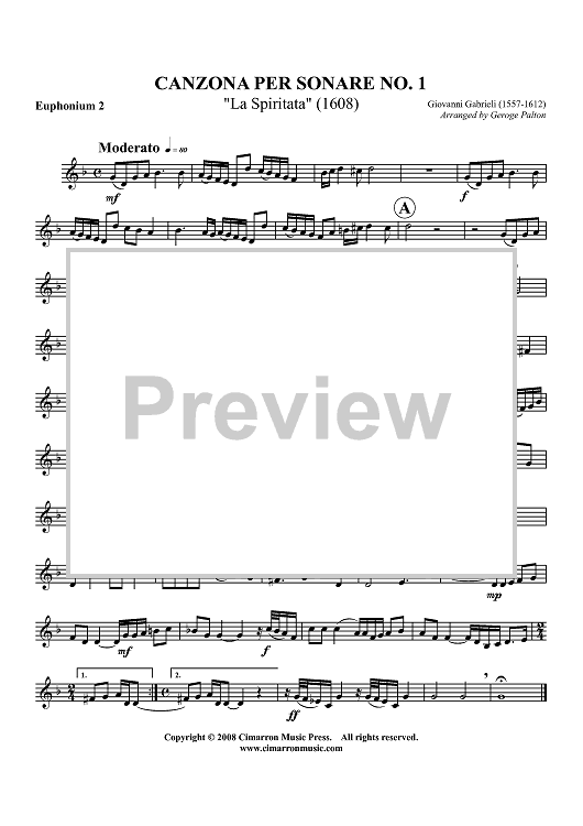"Canzon per Sonare No. 1 "La Spiritata" (1608) - Euphonium 2 BC/TC" Sheet Music by Giovanni Gabrieli
