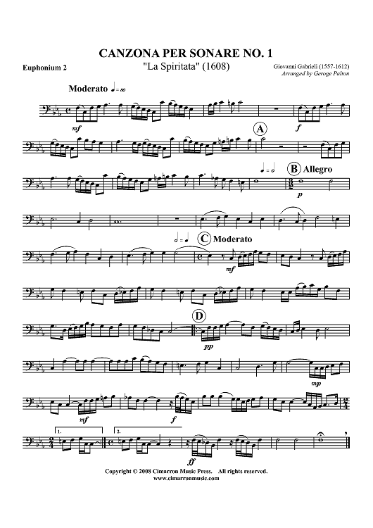 Digital Sheet Music for Canzon per Sonare No. 1 "La Spiritata" (1608) - Euphonium 2 BC/TC by Giovanni Gabrieli, George Palton scored for Tuba Quartet; id:416336