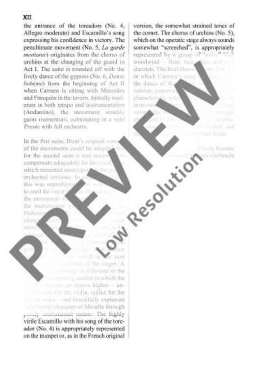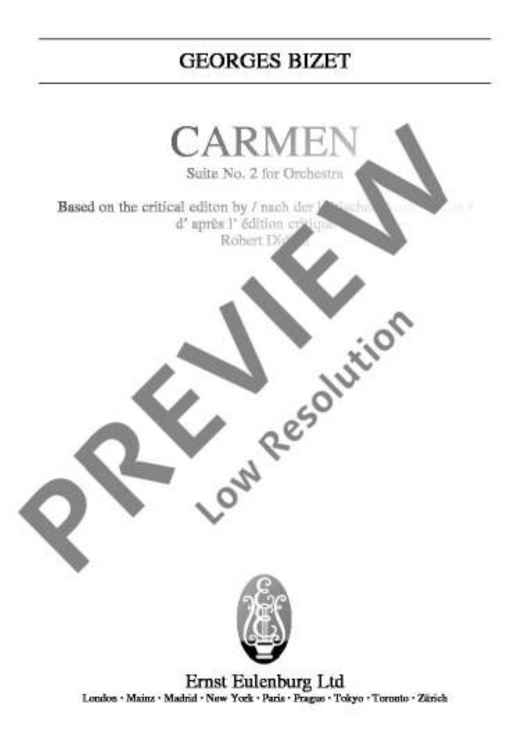 Carmen ist eine der beliebtesten und weltweit meist aufgeführten Opern. Ihr Komponist Bizet hat die Uraufführung, die ein Misserfolg war, nicht mehr erlebt. Die Oper setzte sich jedoch rasch an allen großen Bühnen durch und zog unzählige Bearbeitungen einiger besonders schöner Musiknummern nach sich, darunter die Carmen-Phantasie für Violine und Orchester des spanischen Violinvirtuosen Pablo de Sarasate. Höchstwahrscheinlich war es Bizets enger Freund und Studienkollege Ernest Guirauds, der insgesamt 12 Nummern der Oper in zwei Orchester-Suiten zusammenfasste. Die fehlenden Singstimmen hat er, wie es in solchen Fällen üblich war, durch Instrumente ersetzt. Neben den beiden Taschenpartituren sind Dirigierpartitur und Orchesterstimmen als Leihmaterial erhältlich. Der Notentext basiert auf unserer wissenschaftliche Neuausgabe der Oper, herausgegeben von Robert Didion.