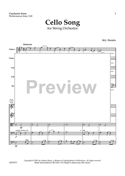 "Cello Song - Score" Sheet Music by M. L. Daniels