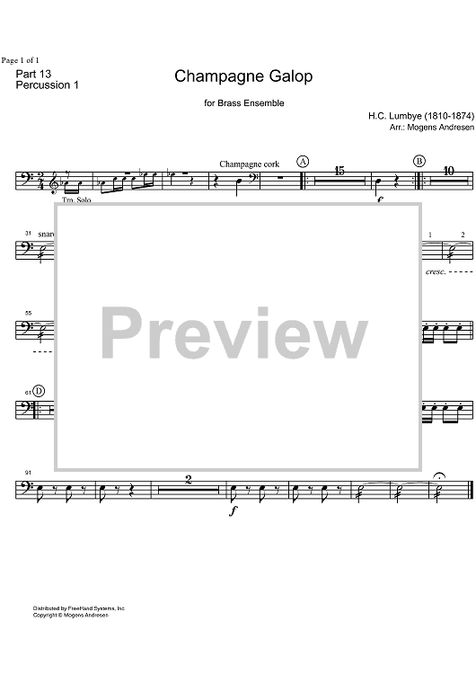 Digital Sheet Music for Champagne Galop - Percussion 1 by Mogens Andresen, Hans Lumbye scored for Brass Ensemble; id:328083