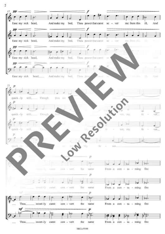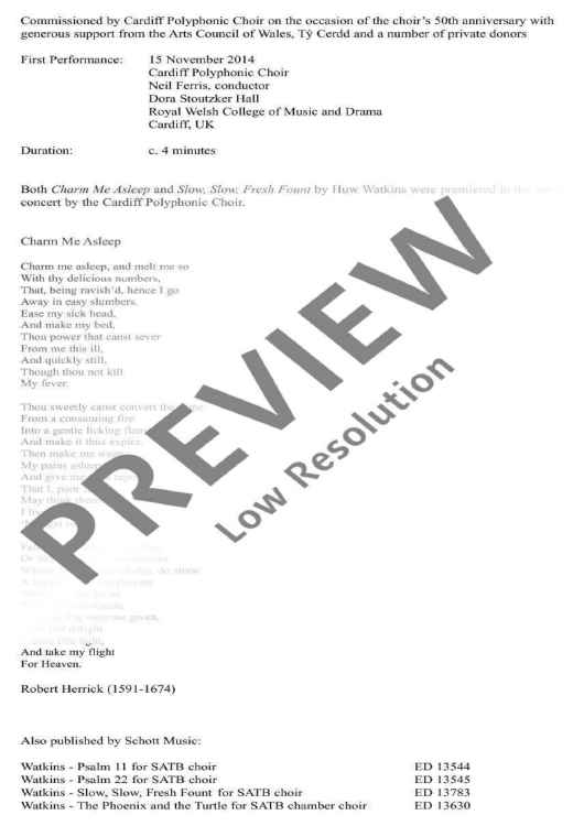 Charm me Asleep is a gentle, lilting piece with a beautiful melody and homophonic texture. This is one of a pair of works, along with Slow, Slow, Fresh Fount, written by Watkins for the Cardiff Polyphonic Choir on the occasion of its 50th anniversary; performed together or separately, they are excellent additions to the repertoire.