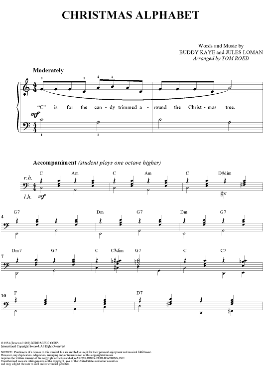 Digital Sheet Music for Christmas Alphabet by Tom Roed, Buddy Kaye, Jules Loman scored for Easy Piano/Vocal; id:249741