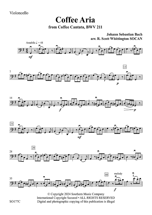 Digital Sheet Music for Coffee Aria from Coffee Cantata, BWV 211 - Violoncello by Johann Sebastian Bach, R. Scott Whittington scored for Orchestra; id:504227