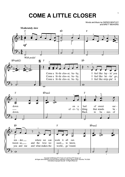 Digital Sheet Music for Come A Little Closer by Dierks Bentley, Brett Beavers scored for Easy Piano; id:391946