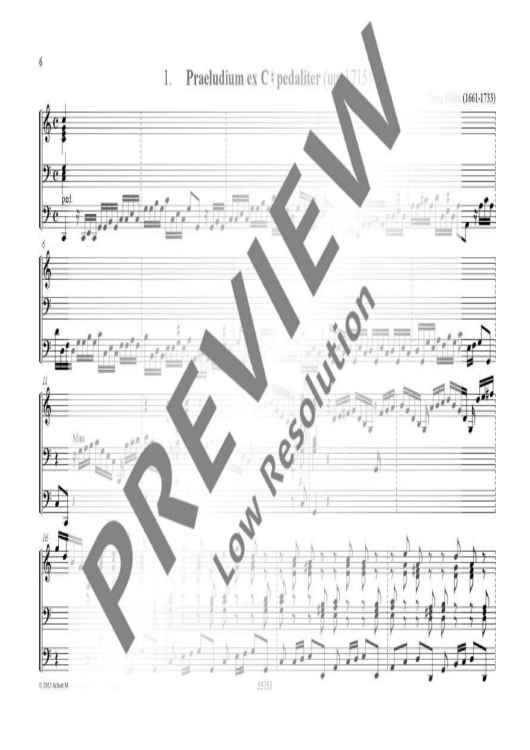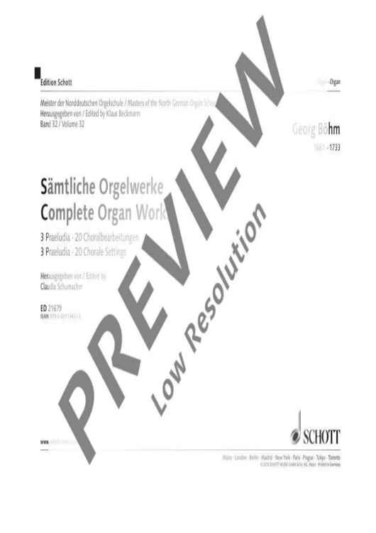 Georg Böhm, born in Hohenkirchen near Erfurt in 1661, died in Lüneburg in 1733, is one of the great masters of the North German Organ School. His works are very popular, and rightly so, and have become permanent fixtures in organ concerts and church services. Our new edition contains three preludes and 20 choral arrangements and follows exactly the original text as well as the current state of organological research. The works, recorded in the so-called 'letter tablature', have been carefully transcribed into modern notation so that the original articulation and rhythm notation remain unchanged. Thus, the edition provides the player with all information needed for a responsible historical performance practice. Important new publication for all organists and organ teachers! A leaflet containing all works in the series 'Meister der Norddeutschen Orgelschule' [Masters of the North German Organ School] is available at No. KAT 3151-99.